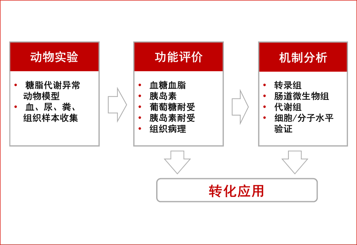 豐富的疾病模型積累與多組學分析相結(jié)合,全面預測、篩選、評估候選物的功能,滿足不同目的和階段的研發(fā)需求??梢蚤_展血糖調(diào)節(jié)、血脂調(diào)節(jié)等保健品功能評價,防控肥胖、2型糖尿病和脂肪肝的食品、保健品和生活方式干預等的功效評價,中藥、天然化合物、候選藥物的功效篩選和評價,以及代謝性疾病機制研究。