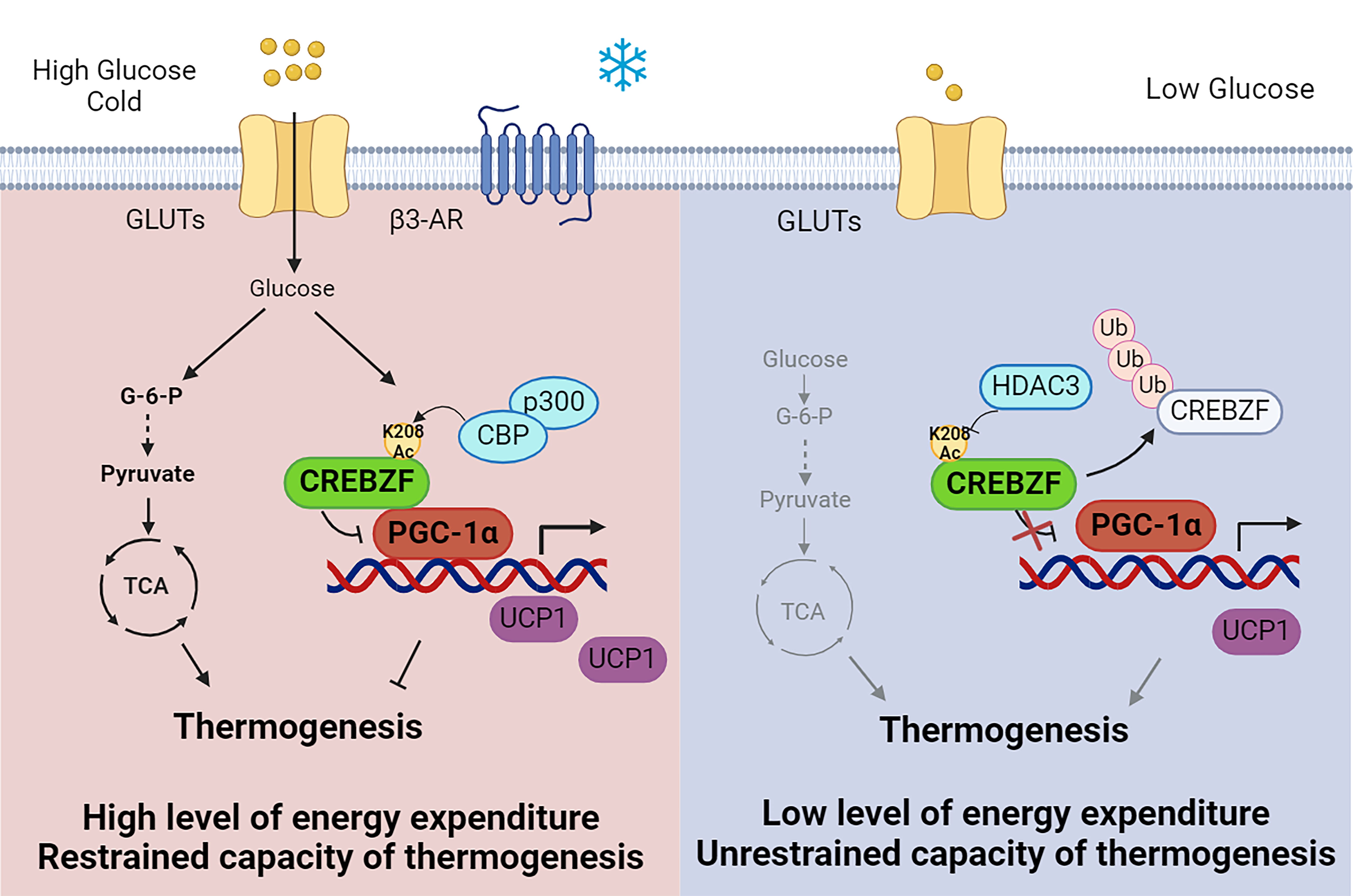 (在低溫及環(huán)境信號(hào)刺激時(shí),脂肪細(xì)胞將大量攝取葡萄糖,一方面可作為供能物質(zhì)直接為脂肪細(xì)胞提供能量,另一方面,葡萄糖信號(hào)通過(guò)CBP/p300增加CREBZF乙酰化修飾及蛋白穩(wěn)定性,CREBZF將與PGC-1α結(jié)合抑制產(chǎn)熱相關(guān)基因表達(dá),限制脂肪細(xì)胞對(duì)能量過(guò)度消耗。本研究表明CREBZF是感知葡萄糖信號(hào)通路中的關(guān)鍵因子,CREBZF對(duì)葡萄糖感應(yīng)的失調(diào),在能量過(guò)剩造成的肥胖及相關(guān)代謝疾病發(fā)生發(fā)展中發(fā)揮重要作用)