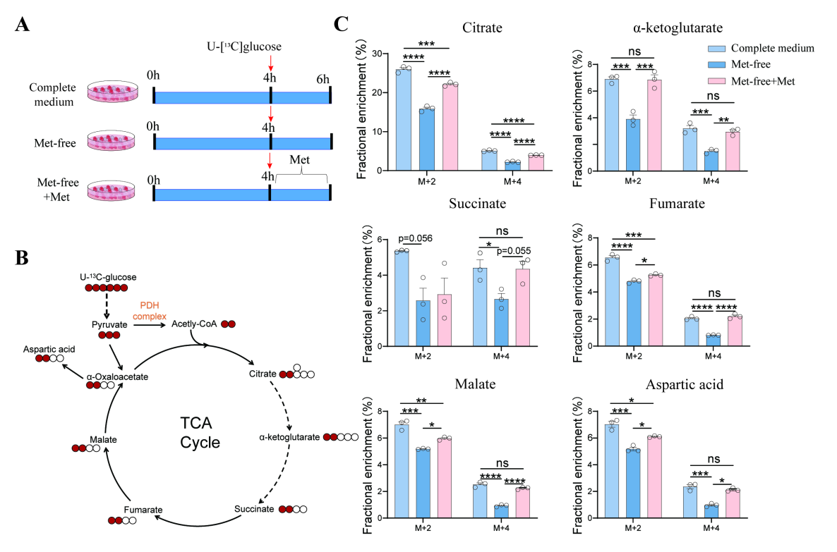 圖:通過碳同位素示蹤技術(shù)(13C-Glucose代謝流分析)發(fā)現(xiàn),剝奪甲硫氨酸可顯著降低TCA循環(huán)代謝物(如檸檬酸、α-酮戊二酸)水平