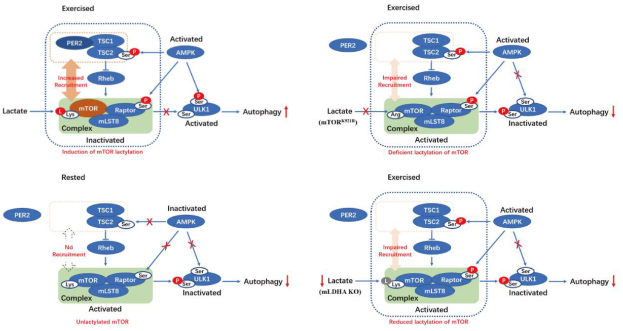 為進一步揭開上述現(xiàn)象背后的分子機制面紗,研究團隊將目光投向了自噬的關(guān)鍵負調(diào)控因子—mTORC1。團隊發(fā)現(xiàn),乳酸并非通過傳統(tǒng)信號通路,而是直接對mTOR蛋白本身進行了一種新型的翻譯后修飾—乳酸化修飾。通過質(zhì)譜分析等技術(shù),團隊精準定位了mTOR蛋白上一個高度保守的乳酸化修飾位點:第921位賴氨酸(K921)。為驗證該位點的功能,研究人員構(gòu)建了該位點突變(K921R)的小鼠模型。令人驚訝的是,當mTOR的K921位點無法被乳酸化時,運動無法有效抑制mTORC1的活性,導(dǎo)致自噬誘導(dǎo)受阻,小鼠同樣表現(xiàn)出與乳酸缺陷小鼠類似的肌肉功能障礙。這證明mTOR K921的乳酸化是連接乳酸信號與自噬激活的關(guān)鍵分子開關(guān)。進一步的機制研究表明,該乳酸化修飾通過促進負調(diào)控蛋白TSC1和節(jié)律蛋白PER2募集至mTORC1,從而抑制其活性。此外,研究還發(fā)現(xiàn),該修飾對于運動同時激活的AMPK有效抑制mTORC1也是必需的。