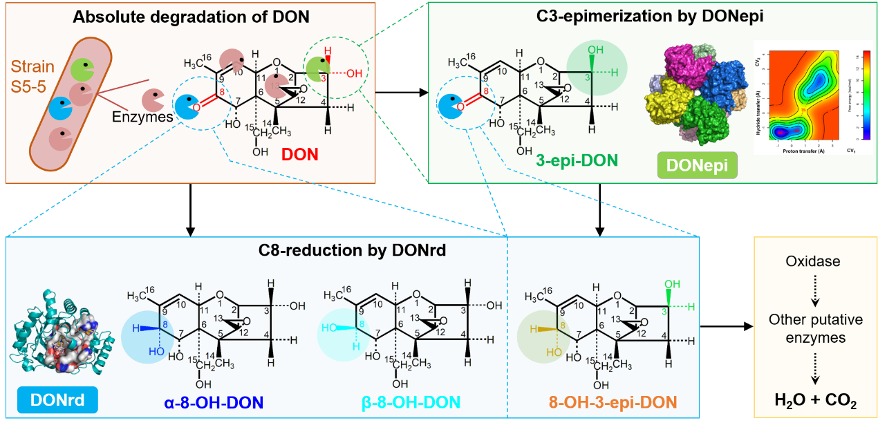????2月26日,中國科學(xué)院上海營養(yǎng)與健康研究所武愛波研究組合作揭示了將脫氧雪腐鐮刀菌烯醇(DON)毒素完全降解形成CO2和H2O的作用機(jī)制,闡明了完全降解過程起始代謝路徑及關(guān)鍵毒素降解酶,并對(duì)降解酶蛋白結(jié)構(gòu)、核心催化機(jī)制和生物技術(shù)應(yīng)用潛力進(jìn)行了系統(tǒng)解析。相關(guān)研究成果以“Specialized aldo-keto reductases trigger complete degradation of?mycotoxin deoxynivalenol”為題在Nature Communications期刊在線發(fā)表。